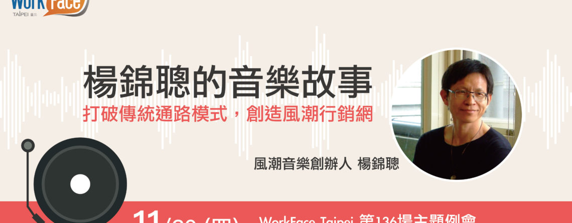 WorkFace Taipei 第 14 群組:美學、藝術與建築,邀請到風潮音樂創辦人楊錦聰來分享他的創業故事,在不斷的困境中如何堅持喜歡的事,在數位浪潮下如何逆勢成長及茁壯,歡迎你一起來聽聽!