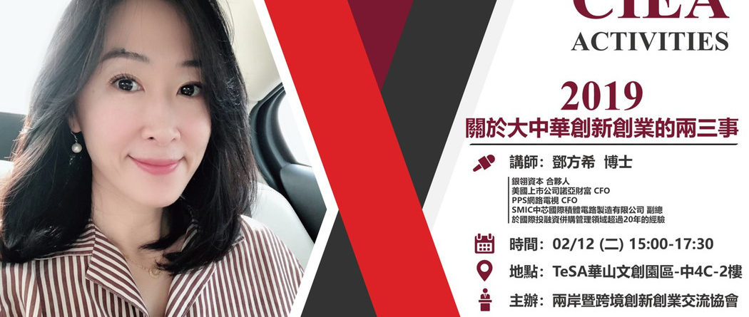 2019年的首場講座,CIEA特別請到了知名創投機構-銀翎資本合夥人 鄧方希博士,除了跟所有會員們分享2019大中華創新創業的發展狀況之外,更會針對會員們的項目討論,看是否有合作投資的機會,會員們千萬別錯過這次的講座囉!