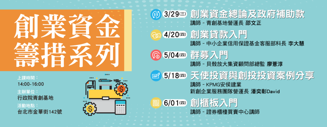 開始時間:2017-02-15 14:00:00 結束時間:2017-02-15 16:00:00 主辦單位:行政院青創基地 連絡電話:02-2358-4548 連絡Email:startuphub.service@gmail.com 地 點:金華街142號 費用性質:免費 內容說明: ▲課程介紹 你知道政府一年投入多少資源在協助青年創業嗎? 你知道除了SBIR、創業天使計畫之外, 還有哪些創業資源嗎? 你知道你的創業項目適合申請哪種政補助嗎? 如果你有以上的任何一個問題 那你一定要來聽這堂課 青創基地駐點業師邵文正長期匯整政府創業資源 並累積數百個團隊的輔導經驗 讓你一次搞懂政府創業資源 ▲講師介紹 青創基地邵文正駐點業師 長期匯整政府創業資源並累積了數百個團隊的輔導經驗 ▲活動資訊 ●活動日期:2/15 (三)14:00-16:00 ●活動地點:行政院青創基地 ●2/15課程報名傳送門:https://goo.gl/356TQ5 ▲行政院青創基地 ● 諮詢預約:(02) 23-58-4548 (我發, 是我速發) ● 地址:台北市大安區金華街142號(捷運東門站5號出口)