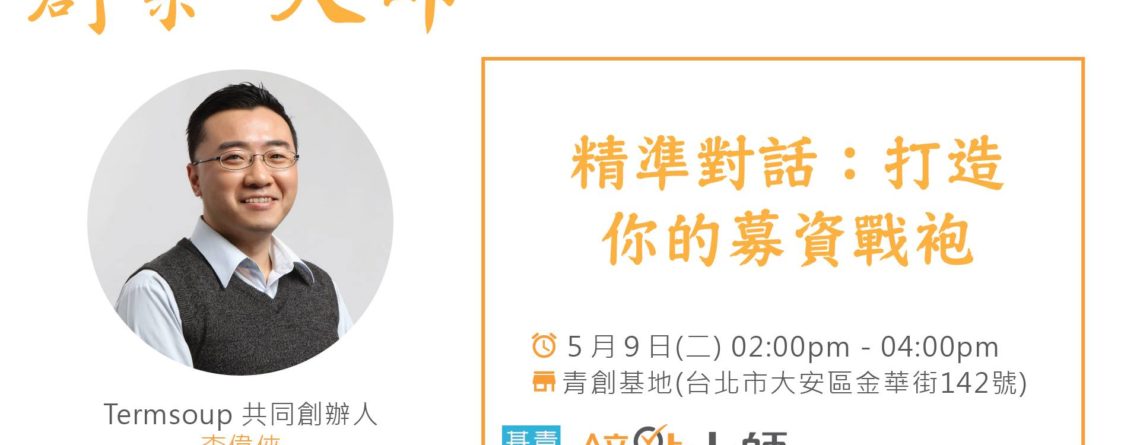 開始時間:2017-05-09 14:00:00 結束時間:2017-05-09 16:00:00 主辦單位:行政院青創基地 連絡電話:02-2358-4548 連絡Email:startuphub.service@gmail.com 地 點:金華街142號 費用性質:免費 內容說明: 許多新創團隊,擁有很棒的創意,然而,卻總在募資時候,以失敗收場。其實,一場好的募資,是必須有完整的準備,才能在投資家面前,展現團隊創意的未來發展,並獲得投資人的青睞,進而得到被投資的機會。 這堂講座將分享講者所撰寫的《新創募資教戰》這本書,並且告訴聽眾有哪些事情是創業者在創業前或創業過程必須了解的,要如何規劃募資,以及除了募資之外新創團隊還有哪些選擇。講者希望能藉由這場分享讓聽眾更了解募資的本質和原則。 創業.大師- 十二大領域、100%由公司創辦人親自分享創業實戰經驗與策略 第四場|5/9|精準對話:打造你的募資戰袍|李偉俠| 活動介紹 - 透過接力的方式,由各領域的創業家親自分享經驗與策略,幫助正在創業的創業者從企業管理、募資簡報至業務與行銷,解析創業細節乃至國際趨勢,佐以實際案例分析,讓創業者除了可以避免誤觸陷阱,更能少走冤枉路,將經驗與趨勢結合進創業過程中,達到A→A+的迅速成長。 活動流程 - 13:30-14:00 入場 14:00-14:05 主持人開場 14:05-15:45 講者時間 15:45-16:00 問答 講者介紹 - 講者|李偉俠 李偉俠(Vincent)是創業方法與募資規劃講師、《新創募資教戰》作者,在工研院、資策會、經濟部工業局等多個政府及民間機構輔導及教學,目前也是譯者翻譯工具Termsoup共同創辦人。