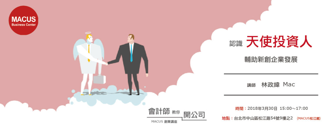 MACUS創業講座 會計師教你開公司 認識「天使投資人」輔助新創企業發展 講師:林政緯 Mac 時間:2018年3月30日 15:00-17:00 地點:台北市中山區松江路54號9樓之9(MACUS松江館) 報名方式:前往此網站填寫報名資料https://www.accupass.com/go/macusbc0330 公司官方網站:https://www.macusbc.com/